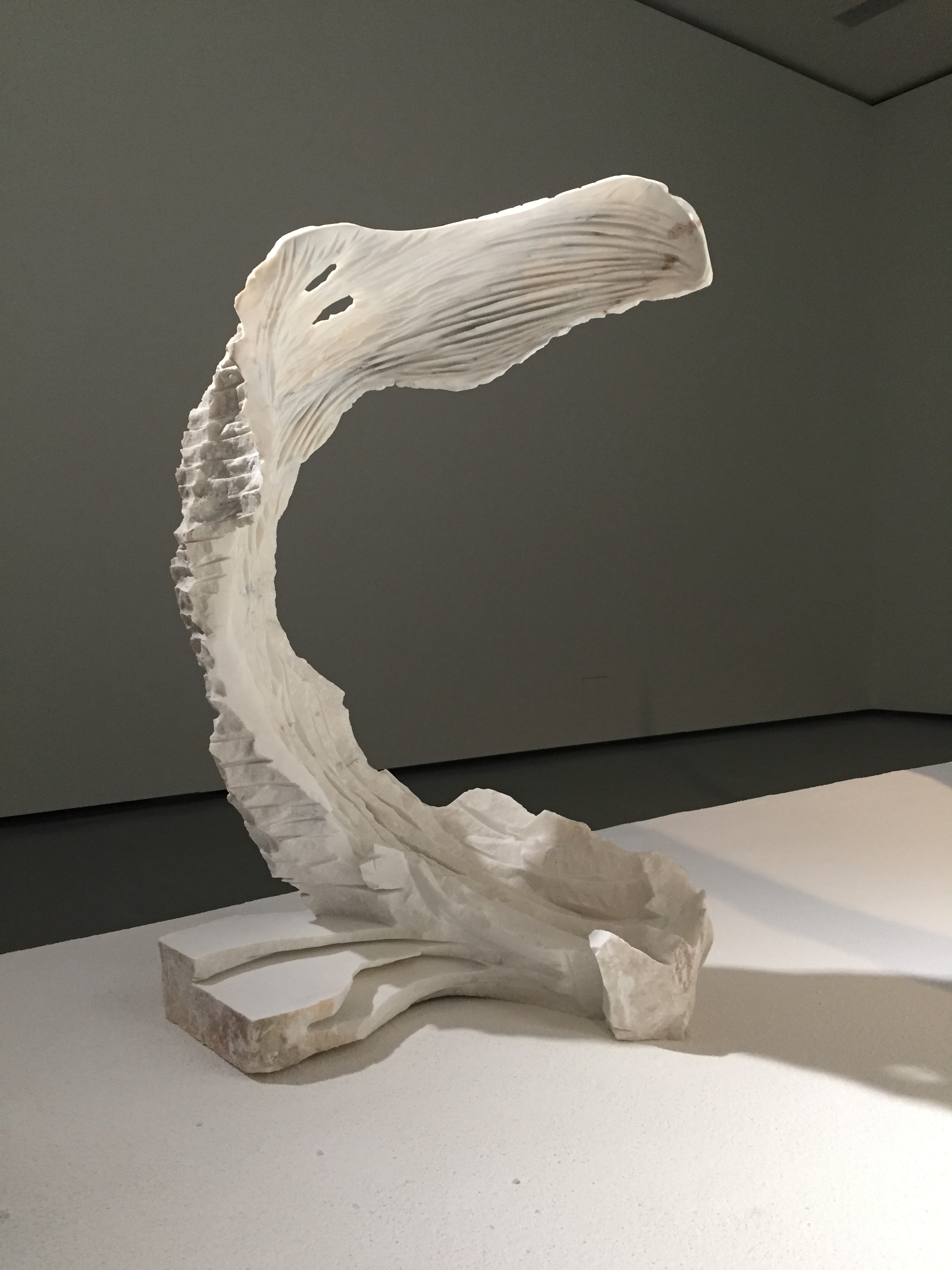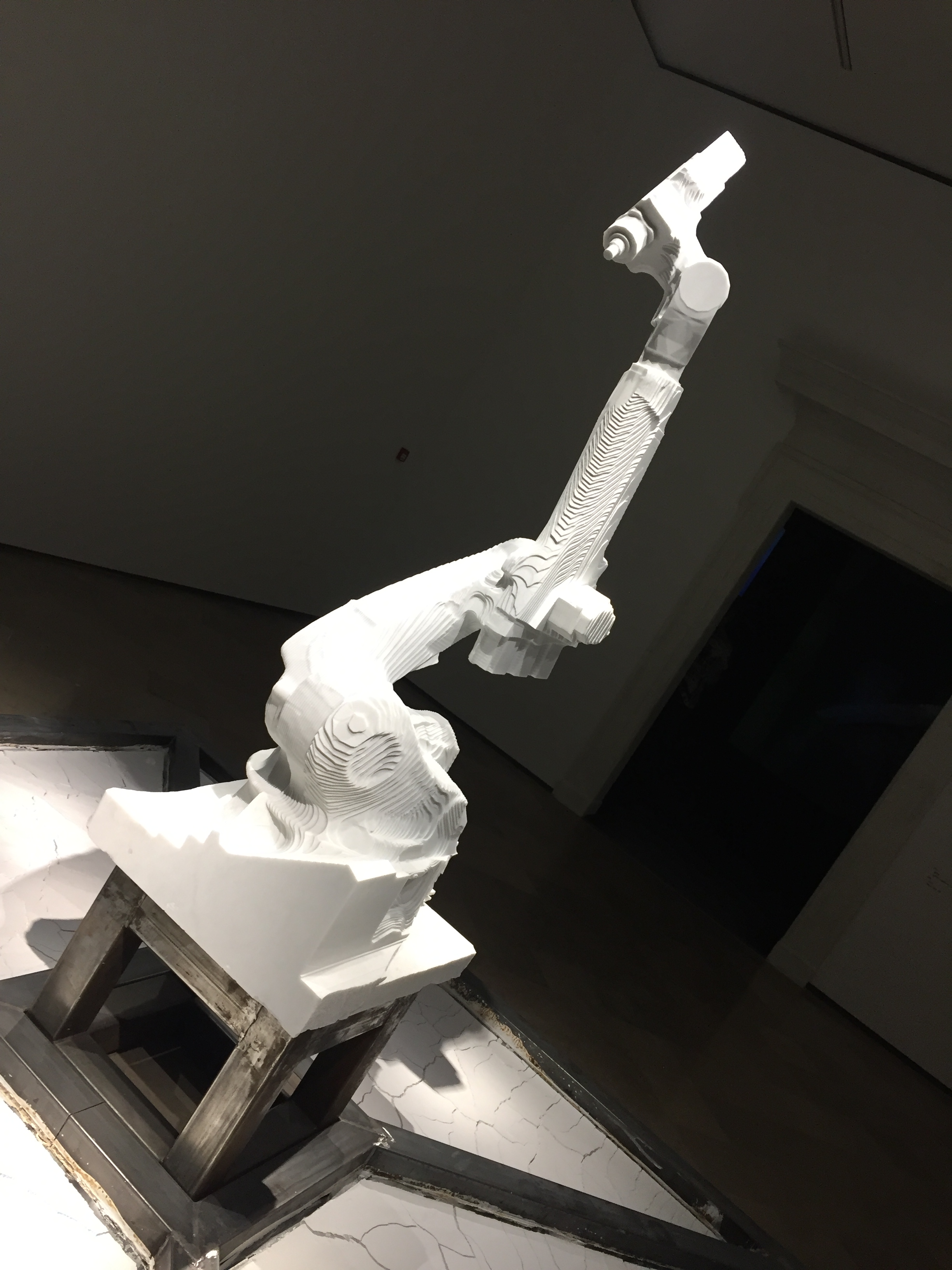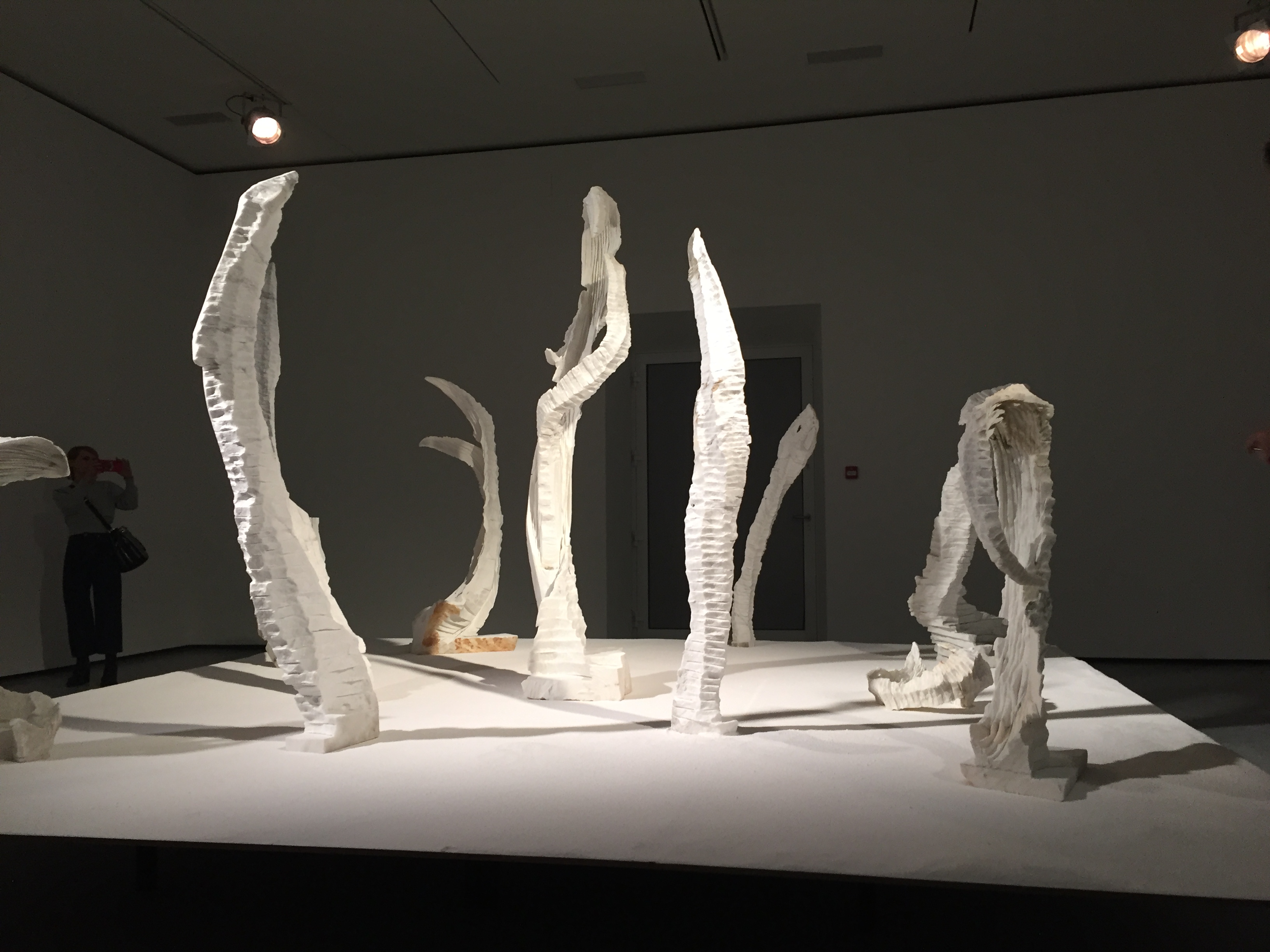 Szlifierka kątowa nie jest używana do pracy z marmurem praktycznie nigdy, bo marmur jest zbyt delikatny. Szlifierka generuje więcej odpadów marmurowych niż inne techniki, więc jej użycie jest jakby marnotrawieniem i zabawą z kamieniem, ciągłym patrzeniem gdzie jest granica, której tworzywo nie wytrzyma. Tak bawi się Pustoła rzeźbiąc białe, ażurowe kształty przypominające egzotyczne rośliny. Na wystawie jest platforma pokryta pyłem i jego rzeźbami – wygląda trochę jak marmurowa pustynia – piękna, ale martwa.
