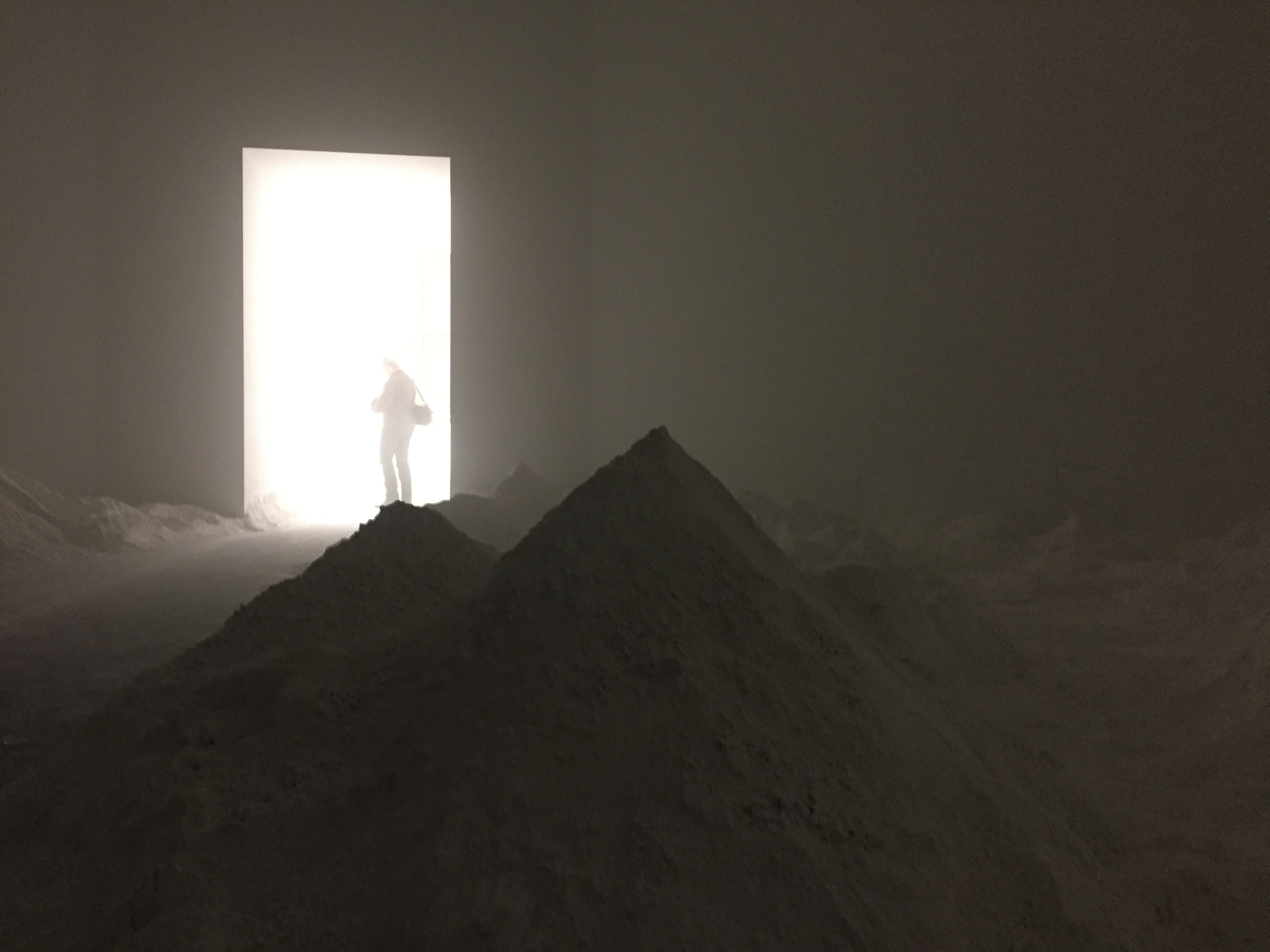 Ten pył możecie poczuć na ustach, wejdzie wam do oczu*. Nie jest to co prawda pył z Carrary, ale z Czech, bo pył marmurowy to produkt, który można nabyć w wielu miejscach. Ten prezentowany na wystawie Cut, pochodzi właśnie z Czech. Stojąc w zapylonym pomieszczeniu czujecie go wszędzie, nie można przykucnąć żeby zawiązać sznurówkę czy zrobić zdjęcie, bo nagle wszystko ma się ubrudzone na biało. Masywy górskie zamienione na góry pyłu. Tylko człowiek potrafi tak zniszczyć, zdegradować. Ale przecież gdyby nie to, nie mielibyśmy rzeźb, ani tych antycznych, ani renesansowych, ani współczesnych marmurowych pomników. Nie cieszylibyśmy się marmurowym blatem, marmurową podłogą, czy nagrobkiem.