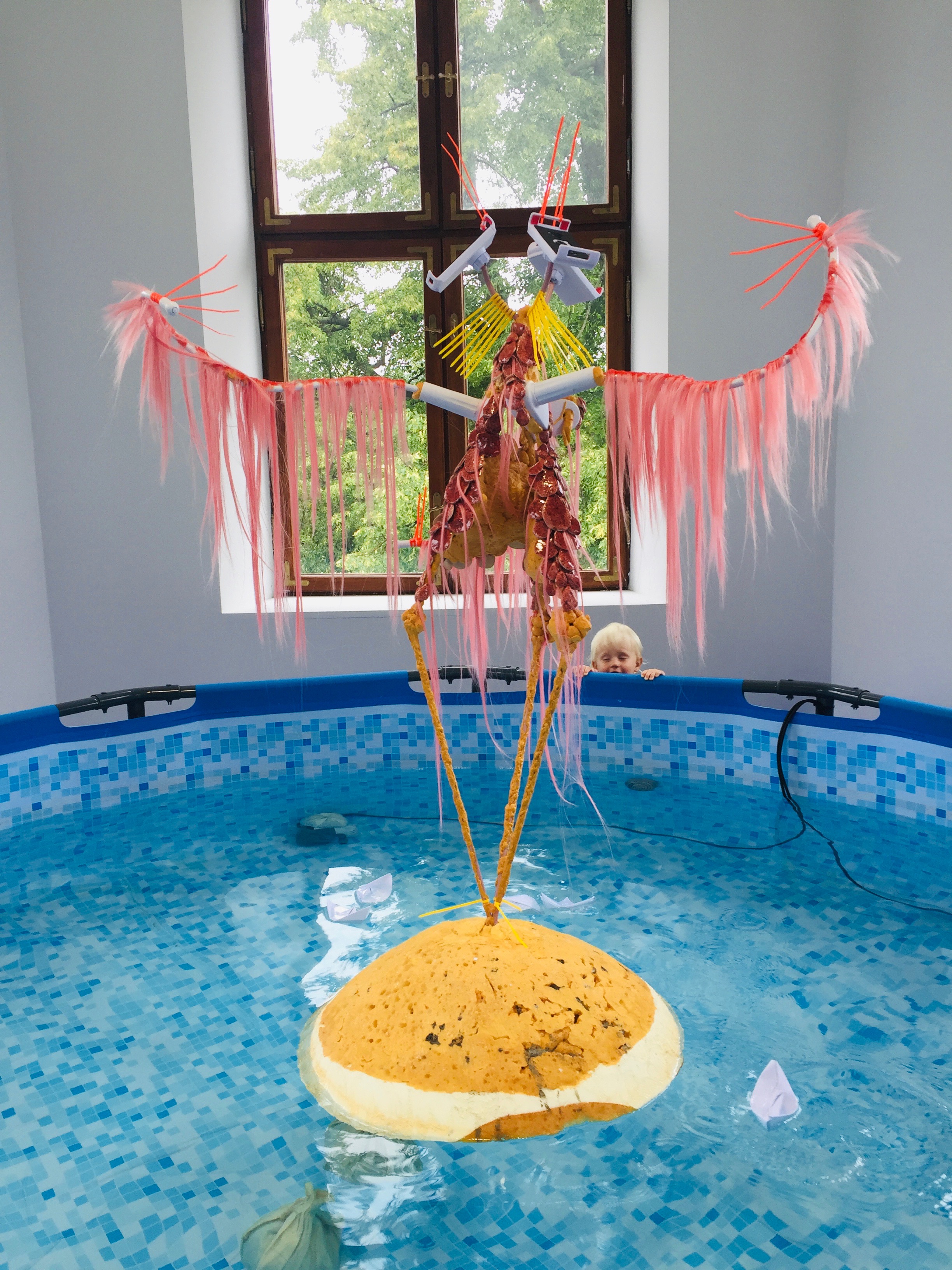 Dalej mijam Gąbczak. On również jest pracą Kokosińskiego i nawiązuje do jego twórczości. Powywijane gąbeczki o różnych długościach, kolorach i fakturach tworzą coś co przypomina mi robaka. Jak ostatnio się okazało dzieci uwielbiają robaki – zawsze, wszędzie i w każdej ilości. Ja się nie będę przytulać do Gąbczaka, jest już zajęty. Za nim trwa budowanie wieży z Bajkostworów. Tu jest miejsce na odpoczynek dla dzieci i rodziców, ale jak widać można się też świetnie pobawić w potworne Zoo.