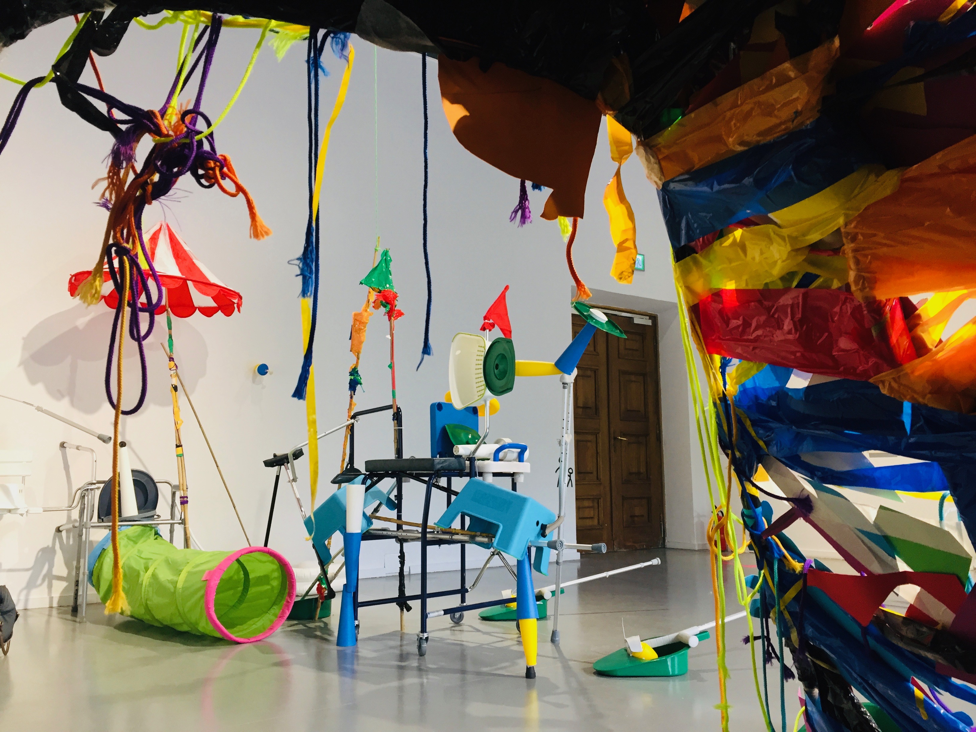 Kolejne sale to więcej dzieł, które wprawiają w dobry nastrój. O ja! Abstrakcja Agaty Królak to tło do którego przymocowane są namagnesowane kształty, dzieciaki same tworzą swoje abstrakcje – tu wszystko się zmienia w ciągu kilku minut, i gwarantuje Wam, że nie zobaczycie dwa razy tego samego dzieła na ścianie. Wiatr i cienie to temat przewodni dzieła Alicji Bielawskiej. Wiał wiatr i podmuch morski sypał snami zachęca do wejścia do wnętrza instalacji, kolorowe paski podwieszone pod sufitem ruszają się razem z nami.