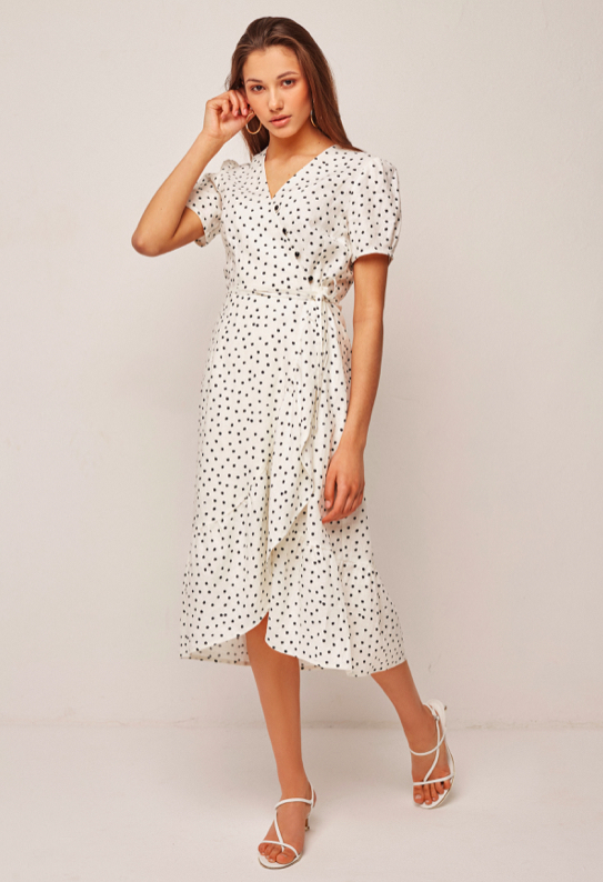 Niszowa marka Madelle szyje sukienki w stylu retro. Tu każdy detal jest dopracowany – zobaczcie guziczki przy dekolcie. Plus za grochy, które są bardzo modne w tym sezonie.
