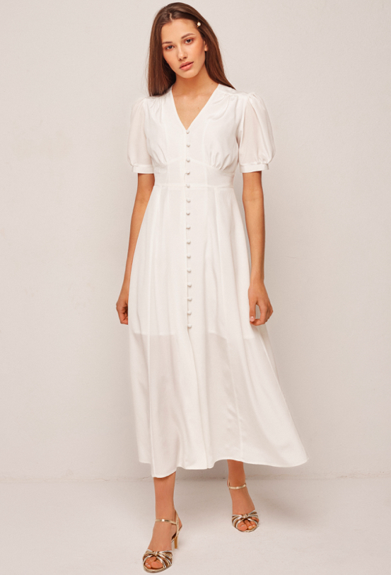 Najbardziej kobieca sukienka z całego zestawienia – biel urzeka i sprawia, że to fason wychodzi na pierwszy plan. Odszyta z jedwabiu jest super delikatna i zwiewna.