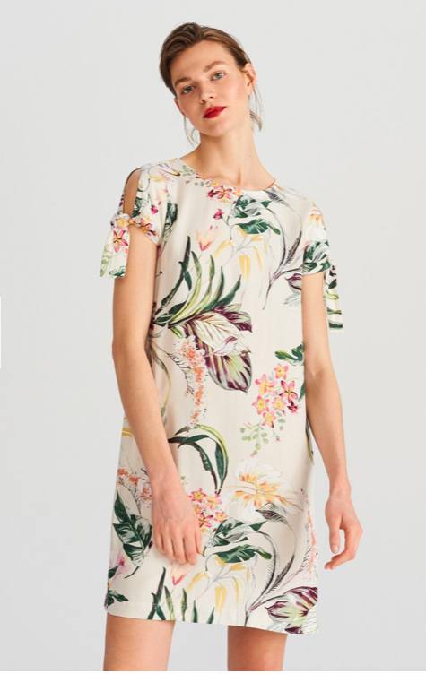 Bardzo prosta i kobieca sukienka w kwiatowy wzór. Nie tylko idealna na dzień w mieście, ale też na imprezę. My zdecydowanie kochamy ją za długość podkreślającą nogi i za wiązane rękawki.