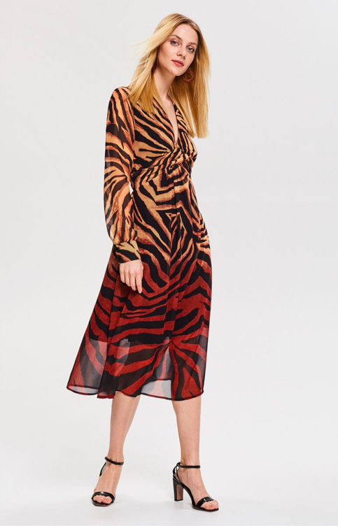 Zwierzęce printy są cały czas w modzie. Tu ich mocny charakter łagodzi delikatność i zwiewność materiału. Plus za połączenie kolorów, które wygląda ciekawie i świeżo.