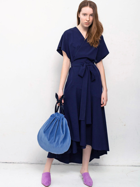 Sukienka dla minimalistek. Ciemny kolor sprawia, że również jest mega praktyczna. Nam podoba się za kimonową górę i wiązanie w pasie. Natomiast kobiecości dodaje spódnica.