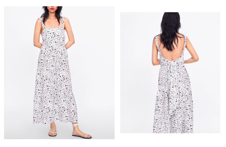 Sukienka typu maksi, sięgająca aż do kostek. Jest bardzo kobieca, podkreśla talię i odsłania plecy. Ach, ten dekolt na plecach i to jeszcze z ozdobym wiązaniem!