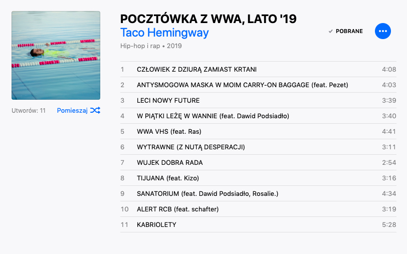 Część kawałków zawiera wstawki z Kroniki Filmowej, ale to tylko dobry początek [600 tys warszawiaków uda się dziś do pracy/ I jak codziennie spora grupa z nich nie podejmie żadnej pracy zarobkowej]. Od nawiązań do innych utworów i szukania perełek popkultury na tej płycie zrobiło się aż ciasno. W „Człowieku z dziurą zamiast krtani” „miasto spaliną oddycha” „tyle słońca w całym mieście, ludzie płoną w samochodach, nie widziałeś tego jeszcze…” słyszymy w „Sanatorium”. Dawid Podsiadło pięknie trawestuje swoje „nie ma fal” w „Piątki leżę w wannie” [W piątki leżę w wannie/Nie mam siły tańczyć ani chlać/ W sumie może wpadnę]. Taco, który jest +/- podmiotem lirycznym „otwiera wino ze swoją dziewczyną” w „Wytrwanym (z nutą desperacji)” i rozpędza się z dobrymi radami w kawałku „Wujek dobra rada”, który ma refreny posklejane ze słów przebojów Molesty i Sokoła – „pamiętaj człowieku, walcz by wygrywać, z ran można się wylizać…” Do tego dochodzą nawiązania do najpopularniejszych nazwisk w mainstreamie kultury, mamy Dorotę Masłowską – która powiedziała już wszystko, co ważne, do Kylie i Kendal Jenner, do Miley i kilku innych gwiazd, których niekoniecznie trzeba słuchać. Padają tytuły seriali i książek, gier. Cała ta śmietanka towarzysko-kulturowa robi swoje. Płyta jest nie tylko ciekawa, ale przez swoją aktualność też ważna. Taco wie, że czasami sprzedaje „oczywiste oczywistości”, ale z drugiej strony potrafi je tak sformułować, że czuję na skórze, że będziemy je śpiewać przez cały sierpień.