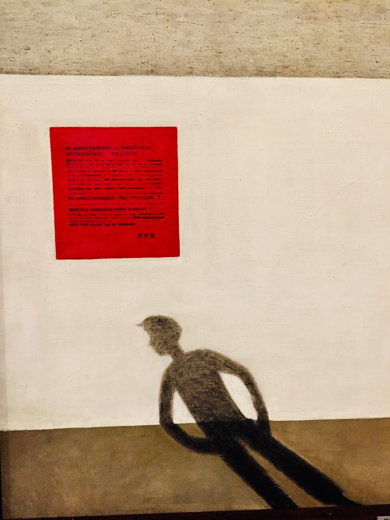 Duchy, cienie, nieludzie to wizja Erny Rosenstein, która nie potrafiła się wyzbyć wojennej traumy jeszcze długo po wojnie. Jej prace to pamięć bólu. Zwracając się ku hasłom antyhitlerowskim Rosenstein czerwoną odezwę PPR umieszcza na białej ścianie, a za nią maluje obozowych wisielców – jej prace mówią: nie zapominajcie i wpisują na stałe w naszą świadomość równanie, że wojna to śmierć i cierpienie, jedyną rozsądną drogą jest więc pokój.
