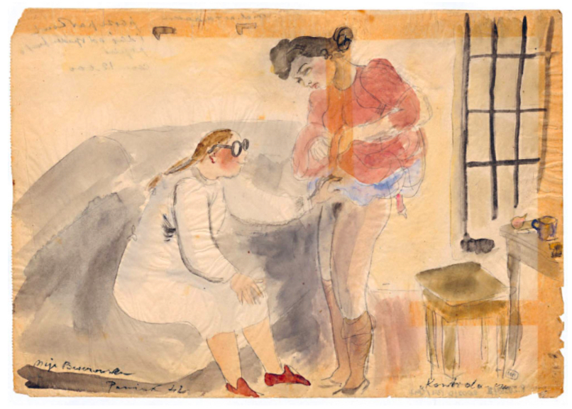 Ale doświadczenia wojenne mogą być rysowane lekką kreską i wypełnione kolorem. Chyba pierwszy raz na wystawie można oglądać prace jednej z popularniejszych polskich ilustratorek i artystek XX wieku. Maja Berezowska przebywając na emigracji we Francji często rysowała dla gazet, między innymi ilustrowała tekst o romansach Hitlera. Rysunki, mimo że piękne, nie spodobały się władzom III Rzeszy. Hitler zabawiający się z kobietami przestawał być srogim wodzem, a zamieniał się w swawolnego kochaneczka. Obrazki nosiły tytuł: „Miłostki słodkiego Adolfa”. Za to Maja trafiła na czarną listę, a po powrocie do kraju na Pawiak i z wyrokiem śmierci do obozu dla kobiet w Ravensbruck- tu, żeby przeżyć Berezowska rysowała, powstawały kolorowe dzieła o tytułach Kibel, czy Kontrola czystości. Na wszystkich artystka zaklina rzeczywistość, współwięźniarki na jej malunkach odzyskują zdrowie, witalność, kobiecość.