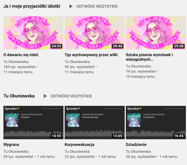 Nie jestem słuchaczem podcastów, ale już jakiś czas temu zatrzymałam się na chwilę przy tym medium. Zaczęło się od polecenia przez koleżankę podcastu o finansach, oszczędzaniu i lokowaniu środków, później już z wypiekami na twarzy odkryłam, że moja ulubiona joginka – Basia Tworek też prowadzi swój podcast – Yogapdejt i fajnie się go słucha. Ostatnio natknęłam się, dzięki koleżankom po fachu, na „Ja i moje przyjaciółki idiotki” i „Tu Okuniewska” – całkiem nowe, całkiem świeże odcinki, które są jak humorystyczna telenowela w przypadku Idiotek, i seria „to co dla mnie ważne” w przypadku Okuniewskiej.