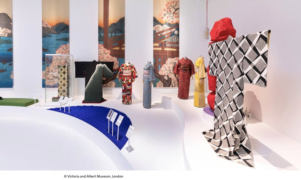 Wystawa „Kimono: Kyoto to Catwalk” [Kimono: z Kyoto na wybiegi mody] jest linearną opowieścią zaczynającą się w połowie XVII wieku, kiedy kimono było ważną częścią życia w Japonii. Różne jego rodzaje odpowiadały różnym grupom społecznym, a świadomość i ambicja elit podsycana przez wytwórców, sprzedawców i same elity napędzały modę. W XIX wieku to świat zachodni po raz pierwszy zachwyca się kimonem, Japończycy produkują swoje odświętne stroje po to, aby je sprzedać. Zaczyna się worldwide craze na wszystko, co związane z krajem Kwitnącej Wiśni. Ten efekt z różnym nasileniem trwa do dziś. Kimono podbiło światowe wybiegi, gwiazdy sceny chętnie je ubierają na występy, ale możemy je również spotkać w naszych domach – ot, choćby szlafrok skrojony podobnie do kimona. Na wystawie pokazane są kimonowe sukienki Björk zaprojektowane przez Alexandra McQueen’a, kimono noszone prze Freddiego Mercury’ego, to zaprojektowane dla Madonny przez Jean’a Paul’a Gaultier i pokazane w teledysku „Nothing Really Matters”. Kimono było stałą inspiracją w modzie, w V&A zobaczymy projekty Yves’a Saint Laurent, Rei Kawakubo, czy Johna Galliano. Są nawet projekty kostiumów wykonanych do „Gwiezdnych wojen” przez John’a Mollo i Trish Biggar. Wystawę uzupełniają obrazy, wydruki, a także rzeczy związane z historią kimona.