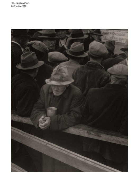 „Nie byłam przyzwyczajona do przepychania się z aparatem w grupach udręczonych, przygnębionych i wściekłych mężczyzn” – wspominała Lange. Efektem tego przepychania jest portret mężczyzny, stojącego w grupie – wszyscy stoją tyłem, on jeden przodem, opiera się o drewnianą barierkę, w rękach trzyma metalowy kubek. Płaszcz i kapelusz są stare i brudne. Jest w tym zdjęciu rezygnacja, przygnębienie, brak reakcji. Zdjęcie znane jest jako White Angel Breadline, i pokazuje dramatyczne skutki bezrobocia. Od tego momentu Dorothea Lange zaczyna się przepychać, znajduje swoje miejsce w tłumie, na poboczach dróg, na chodnikach.