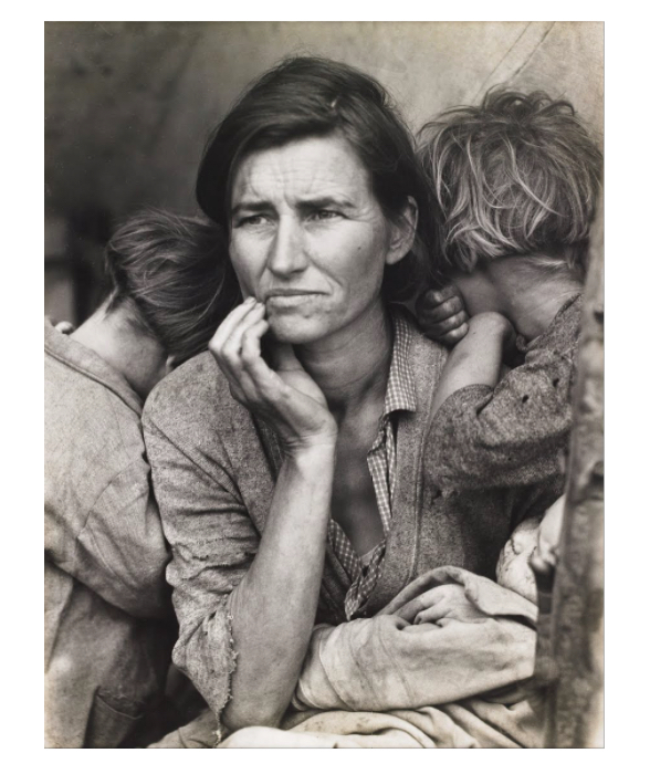 Zdjęcie ukazujące kobietę z dziećmi – kobieta wygląda na zmartwioną, najmłodsze dziecko leży na kolanach, dwójka starszych wtula się w jej ramiona, to zdjęcie znane jako Migrant Mother. Najsławniejsze zdjęcie zrobione przez Dorotheę Lange, która podążała za życiem i zamykała je w kadrach. Jej zdjęcia to głównie Wielki Kryzys, migracje, obozy internowanych i ulice dzielnic o których zapomniała władza Ameryki. Większość z nich postanowiła przypomnieć nowojorska MOMA.