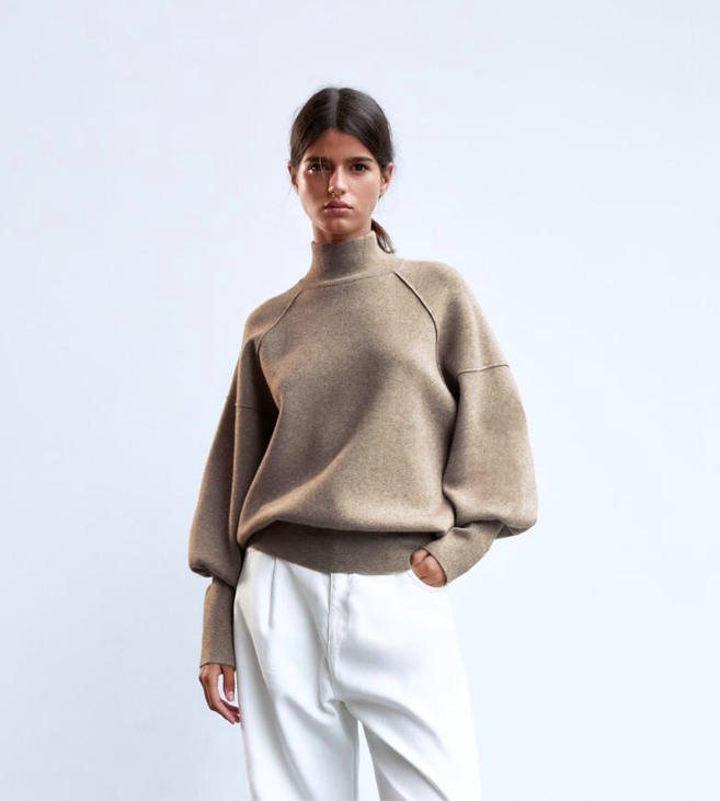 4/ Sweter Zara/ obszerne rękawy, golf, widoczne szwy, sweter który sprawdzi się do garniturowych spodni w kratę i do spódnicy z frędzlami