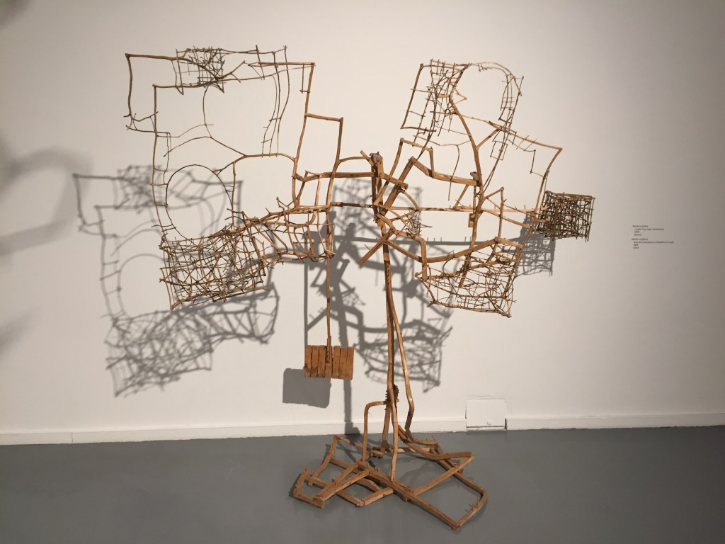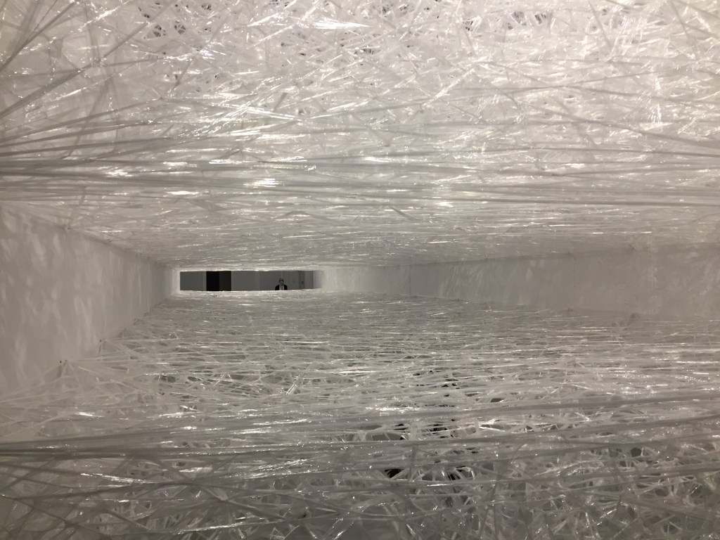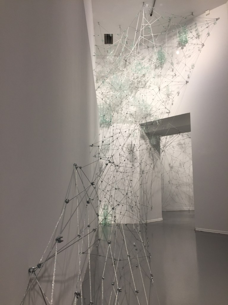 Ludwika Ogorzelec zajęła całkiem sporą przestrzeń CSW. Jej rzeźby można podzielić tematycznie zgodnie z materiałem z którego są wykonane. Są tu instalacje drewniane – lekkie konstrukcje, które swobodnie zwisają z sufitu, płynnie przechodzą z sali do sali, utrzymają balans i równowagę. Zimne, ale delikatne konstrukcje ze szkła i stalowej linki, które rozciągają się od połogi po sufit. I sieć, która przejmuje przestrzeń, stworzona z pleksi, która rozciąga się od ściany do ściany tworząc korytarze i bańki w które można się schować. Instalacje Ogorzelec nie są jedynie formą pomyślaną jako instalacje muzealne, wręcz przeciwnie artystka słynie z tego, że swoje rzeźby często instaluje na zewnątrz, tym samy wpisując je w przyrodę lub architekturę miast.