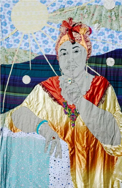 Mirga – Tas również idzie w tym kierunku, na jej tkaninach zobaczymy wiele kobiet, ważnych w historii, ale też bliskich sercu artystki. Siedzące, stojące, pracujące postaci, w całości wyszyte z tkanin są przenoszone na duże, wielkoformatowe płótna. Mirga – Tas używa prześcieradeł, czy zasłon jako tła, a materiały pozyskuje często z secondhandów. Czasami zdarzy się, że portretując konkretną osobę poprosi o coś z jej garderoby. W tych rzeczach zapisany jest żywy pierwiastek, czas, niszczenie, trójwymiarowość świata, którego cały czas doświadczamy. Kobiety i mężczyźni są symbolem wędrówki, zmian, ciągłego rozwoju i poszukiwania. Historia Romów łączy się nierozerwalnie z historią Polski i Europy. O tym opowiada artystka.