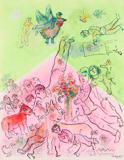 W 1944 roku Bella zmarła. Chagall przestał pracować i nie malował przez rok. Później wrócił do pracy, dwie wystawy w Stanach, gdzie przebywał, i nowa miłość dodały mu sił. Po wojnie postanowił wrócić na Stary Kontynent. Pierwsze ciepłe przyjęcie to Biennale w Wenecji, gdzie Chagall dostał swój własny pawilon.