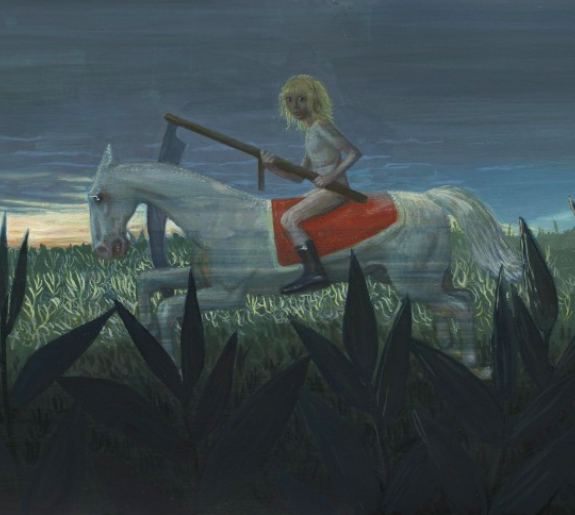 Ta wystawa jest jak świat mrocznej baśni. Zaczynamy od śmierci, choroby, rozkładu i dużego obrazu Waliszewskiej przedstawiającego dziewczynkę na koniu. Siedzi na nim okrakiem, jest praktycznie naga, nie licząc butów. W rękach trzyma kosę. Zerka na wchodzących z ukosa, a może patrzy na szkielet postawiony tuż przed nią? To dziewczynka czy sama Śmierć? Tego nie wiemy, możemy jedynie zgadywać.
