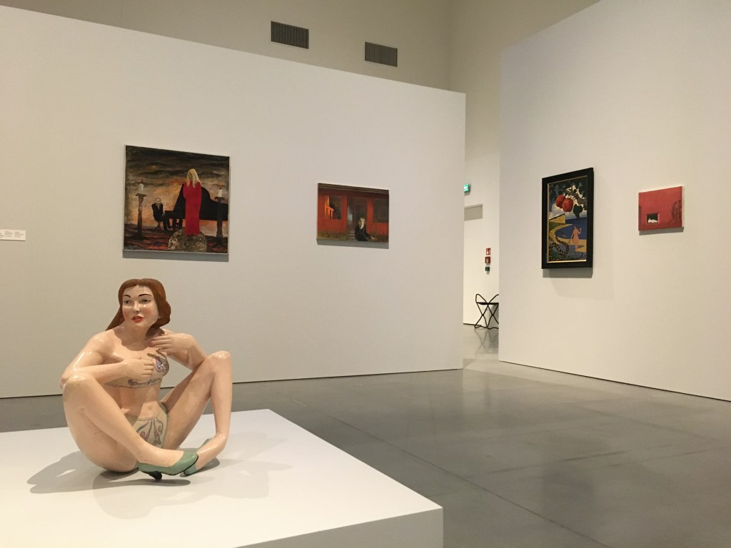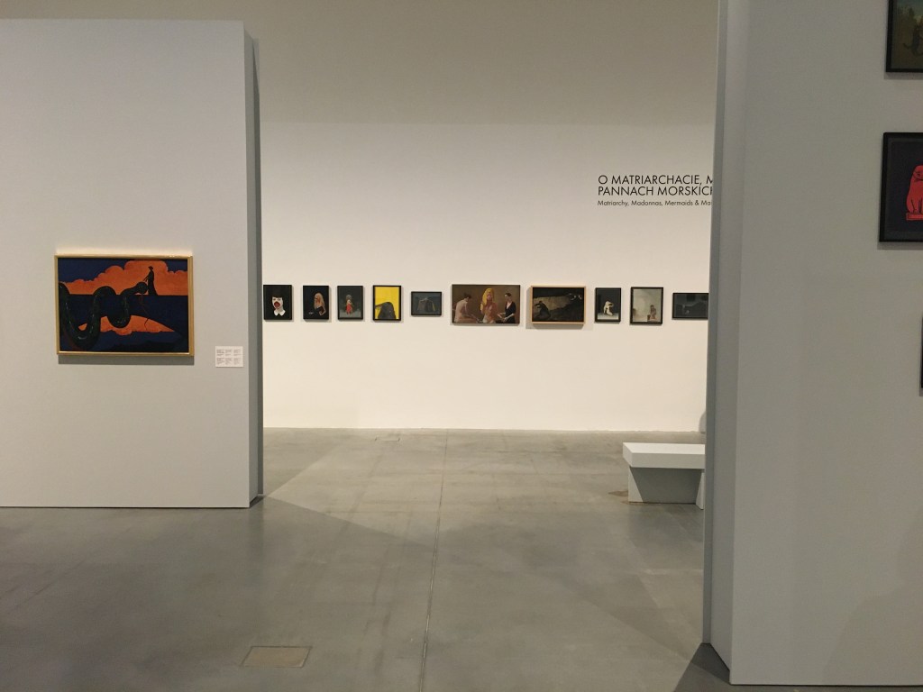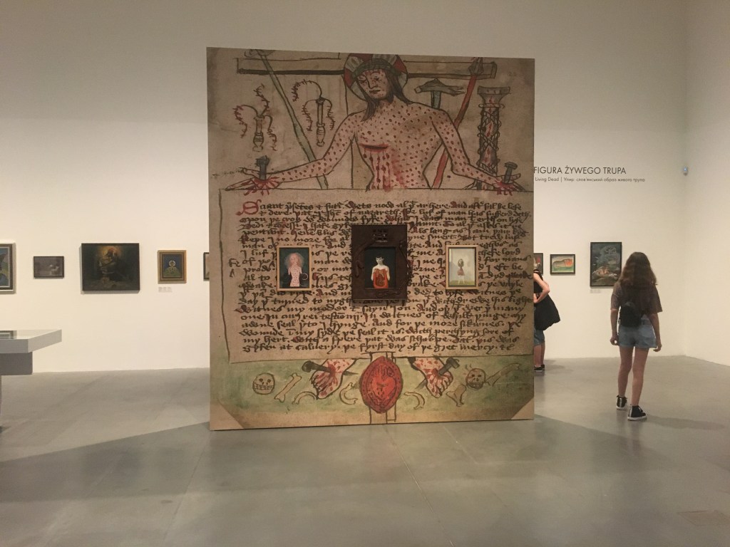 Na tapecie z dziewczynką wisi dzieło Antanasa Žmuidzinavičiusa. To „Żałość” – człowiek zagubiony gdzieś w lesie, otoczony przez cienie. Na ścianach rząd obrazów, między nimi przykryty czarnym płótnem obraz „Młodość i starość” Stefana Żechowskiego. Dwie kobiety jak w lustrze obijają się w sobie, jedna młoda i jędrna – stoi do nas tyłem, druga stoi przodem i nawet nie jest stara, starość ma już dawno za sobą. U Waliszewskiej młode dziewczyny, z blond lokami brodzą wśród czaszek, są obejmowane przez kościotrupy. To kruchość i zawodność ludzkiego ciała jest tematem na który patrzymy.