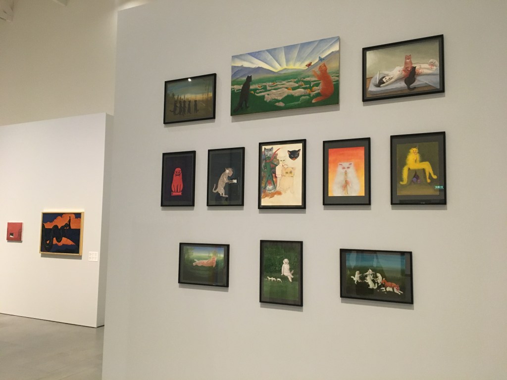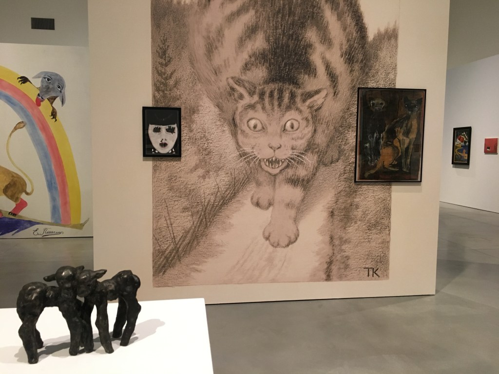 W centrum wystawy stoją tłuste koty. To rzeźby babki artystki – Anny Dębskiej. Jej prababcia pisała bajki dla dzieci, które również Waliszewska udostępniła w MSNie. Jednym z ulubionych motywów Aleksandry jest kot. Jest bohaterem pierwszoplanowym – jak ten puszysty, śnieżnobiały, który gra na flecie. Lub ten który pali fajkę. Jest jeszcze taki, który gra na pianinie. Ale jej koty to również cienie, widać je gdzieś w ciemności, ich oczy bacznie penetrują przestrzeń. Wyglądają tak jakby chciały kogoś upolować. Chyba najbardziej niepokojące są te, które wyłażą z twarzy dziewczynki, pełne są ich jej oczy i usta.