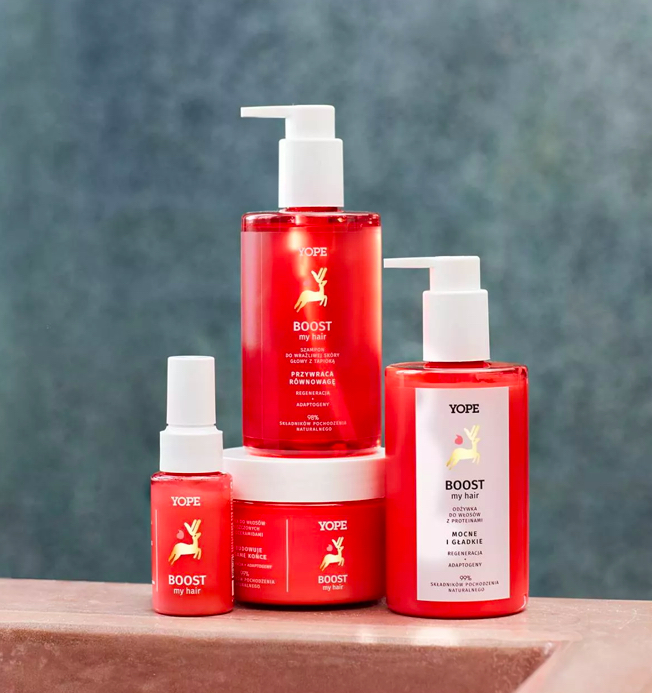 Dziś Yope debiutuje z trzema nowymi liniami. To Balance – linia przeznaczona do włosów przetłuszczających się i potrzebujących odżywienia. Hydrate – nawilża i ujarzmia włosy ze skłonnością do puszenia się. I Boost – dba o równowagę skóry głowy, między innymi dzięki zastosowaniu grzybów reishi, wzmacnia również pasma włosów wyskoporowatych, które odżywia i nawilża, zamykając ich łuski.