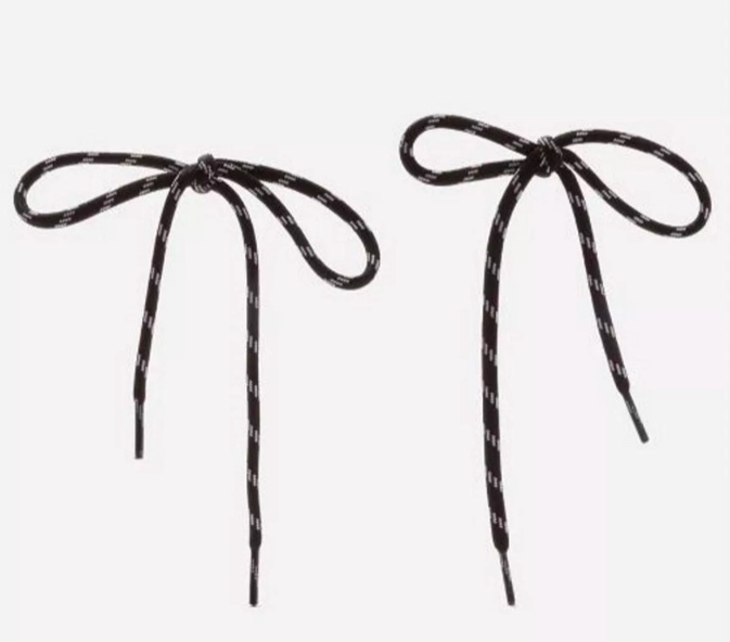 Dziś Demna kusi na pokuszenie kolczykami ze sznurówek. Jeśli się zastanawiacie czy to imitacja sznurówek, to odpowiedź brzmi: nie. To sznurówka, zwykła i pospolita, zawiązana na kokardę i wpięta w ucho. Luksus potwierdza logo marki. I cena. 1600 – tysiąc sześćset złotych. Czy są jacyś chętni? Bo ja zdecydowanie podziękuję.