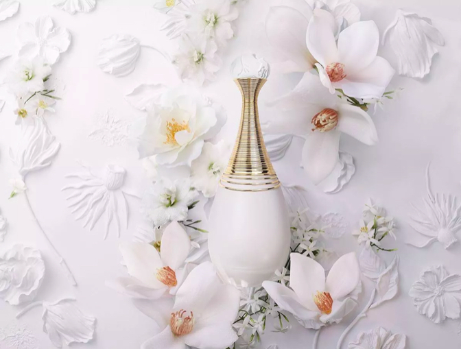 Biały zapach J’adore został zamknięty w oryginalnej butelce. Jej mleczna część zainspirowana jest sukienką Monsieur Diora, którą zaprojektował w 1949 roku. Górna część flakonu to masajski naszyjnik, który zaprojektował John Galliano w 1997 roku. Pierwsze przymiarki do zapachu J’adore ruszyły już rok wcześniej. Wtedy stery w domu mody przejął Galliano, bad boy haute couture. John nie mówił po francusku, ale potrafił się zachwycić wołając: j’adore, j’adore! Ten zachwyt w sposób naturalny odniósł się również do nowego zapachu, dziś już kultowego.