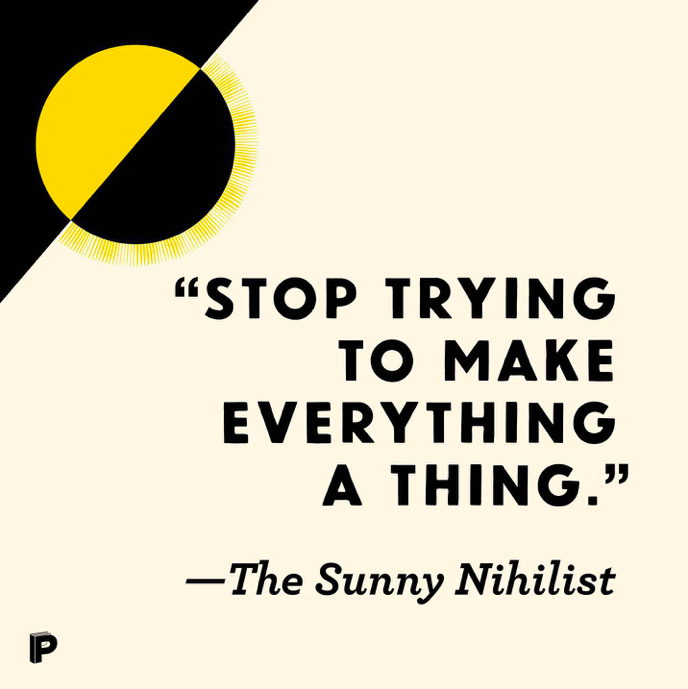 Wendy Syfret dodaje, że szczęśliwy nihilista cały czas musi wstać z łóżka i coś ze sobą zrobić. A jak już coś robi, to musi się liczyć z podstawowymi zasadami fizyki: akcja – reakcja. Szczęśliwy nihilizm nie jest oderwany od życia i rzeczywistości. Ale jak twierdzi Syfret zdejmuje z nas presję, którą sami na siebie nakładamy.