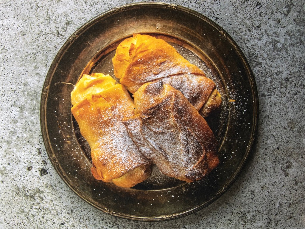 Bartek przy okazji wyprawy do Grecji, postanowił się zapisać do Greek Kitchen na kurs gotowania. Z tej przygody podaje nam przepis na chrupiące ciasto ze szpinakiem – dla mnie pierożki ze szpinakiem. Pierożki pachną miętą i pietruszką, w środku jest także feta, a ciasto przypomina delikatne filo. Na zajęcia chodził do Vasi, która nie tylko uczyła gotować, ale i opowiadała o greckiej kuchni. Mieszają się w niej wpływy państw bałkańskich, Bizancjum, Turcji, ale i Włoch. Podstawę kuchni stanowiła triada: oliwa, pszenica i wino. Vasia opowiadała, że mięsa w diecie Greków było mało, a i ryby były dostępne głównie na wyspach. Z Bizancjum Grecy chętnie przyjęli cytryny, ale też bazylię, czy cynamon. Na pomidory i ziemniaki czekali aż do odkrycia Ameryki, podobnie jak cała Europa.