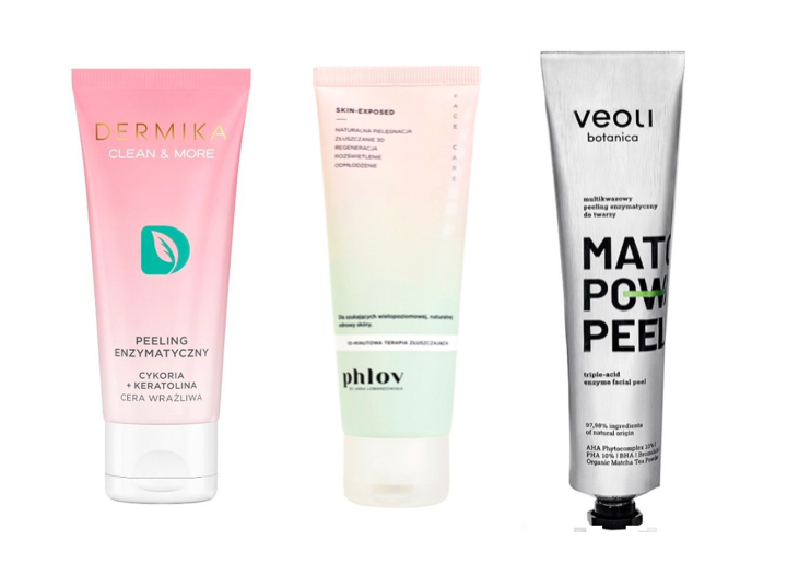 Jeśli macie peelingować to delikatnym Dermika Clean & More z cykorią do cery wrażliwej. Zawiera D-pantenol, który łagodzi podrażnienia. Peeling enzymatyczny phlov to bomba składników – pulpa owoców egzotycznych, borówek, trzcina cukrowa, syrop klonowy, cytryny i pomarańcze. To naturalne kwasy AHA, odpowiadające za złuszczanie i wzmacniające procesy regeneracyjne. Do tego bambus i żurawina w drobinkach. Ten peeling daje dwie możliwości – delikatne złuszczanie i mocne połączone z masażem, kiedy drobinki idą w ruch. Veoli Botanica to kompozycja naturalnych kwasów owocowych: cytrynowy, mlekowy, winowy oraz bromelaina, czyli enzym pozyskiwany z ananasa. Do tego herbata, która ma mocne działanie antyoksydacyjne.