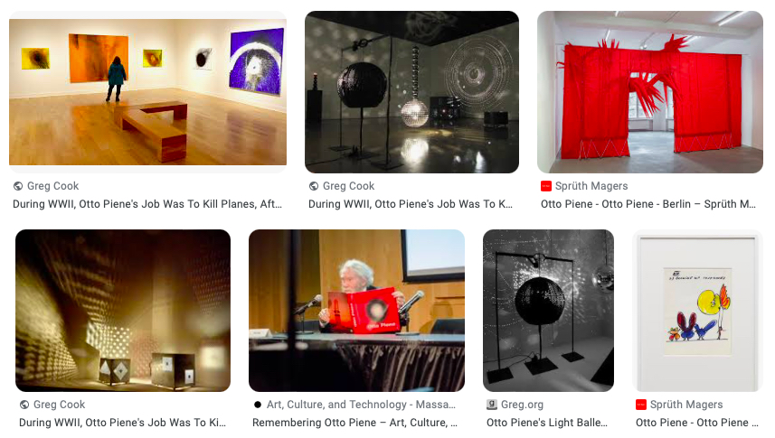W 1959 w Dusseldorfie po raz pierwszy Piene zaprezentował „Balet Świateł”. W całkowicie zaciemnionym pokoju, Otto sam dyrygował światłem z latarki, przepuszczając go przez małe otworki. Dzięki temu na ścianach tańczyły galaktyki świetlistych kropek, układające się w liczne, ruchome wzory. Od tego momentu Piene mówił, że światło jest jego medium.