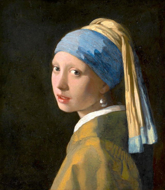 Jeśli się przyjrzycie to większość bohaterek obrazów Vermeera ma przepiękne kolczyki…kolczyki z perłami. Najbardziej znana jest oczywiście „Dziewczyna z perłą”. To obraz wyjątkowy – nie tylko perły są na nim godne zainteresowania. Zwróćcie uwagę na niestandardowe nakrycie głowy dziewczyny, które pokazuje, że Vermeer szukał w modzie ekstrawagancji, nowości i chętnie sięgał po orientalne ozdoby. Jego dziewczyny noszą również męskie nakrycia głowy, modne w Niemczech, czy słomkowe kapelusze sprowadzane z Azji. Wracając do pereł, są piękne, są ogromne i musiały kosztować majątek. Nie wiadomo czy Vermeer widział je kiedyś i namalował, czy były one częścią wyobraźni mistrza – pamiętajmy raczej biednego malarza.