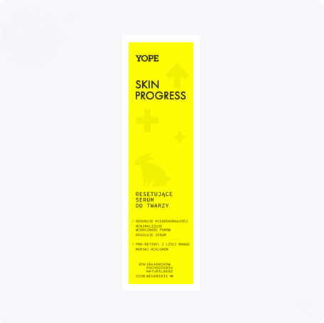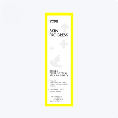 Yope Skin Progress to seria kosmetyków skierowana do młodych, oparta na składnikach naturalnych, aktywnych, których celem jest wyciszenie stanów zapalnych, przywrócenie równowagi, wzmocnienie bariery ochronnej skóry. Kosmetyki te dogłębnie nawilżają, przywracając uczucie komfortu. Prawda jest też taka, że będą równie dobrze działały dla skóry dojrzałej, która boryka się z dysfunkcjami, bo dziś coraz częściej trądzik jest też problemem starszych osób – to zasługa głównie stresu i złej diety.