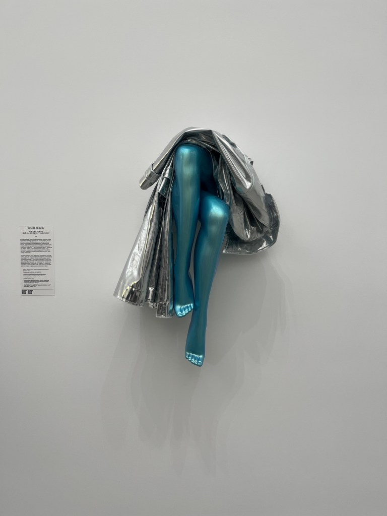 Abakan stanowił zapowiedź wystawy zaplanowanej w galerii C – „Tworzywa sztuczne: ciała, towary, fetysze od zimnej wojny po współczesność”. Ogromna czarno – purpurowa tkanina nadal dominuje, ale nie jest już pokazywana sama. Zaraz po wejściu do sali zatrzymuję się przy „nogach” – to praca Sylvie Fleury, szwajcarskiej artystki, o znaczącym tytule „Silver Rain”. Metaliczne, turkusowe nogi kobiece otacza srebrny, winylowy płaszcz, wszystko wykonane jest z żywicy i włókna szklanego. Włókno szklane było materiałem stworzonym na potrzeby wojska, a później chętnie wykorzystywanym we wzornictwie. Fleury użyła go z namysłem – zwracając uwagę na militarne źródło pochodzenia materiału. Dwuznaczny jest również tytuł dzieła, który może jednocześnie oznaczać atak wojenny, jak i stosunek seksualny.