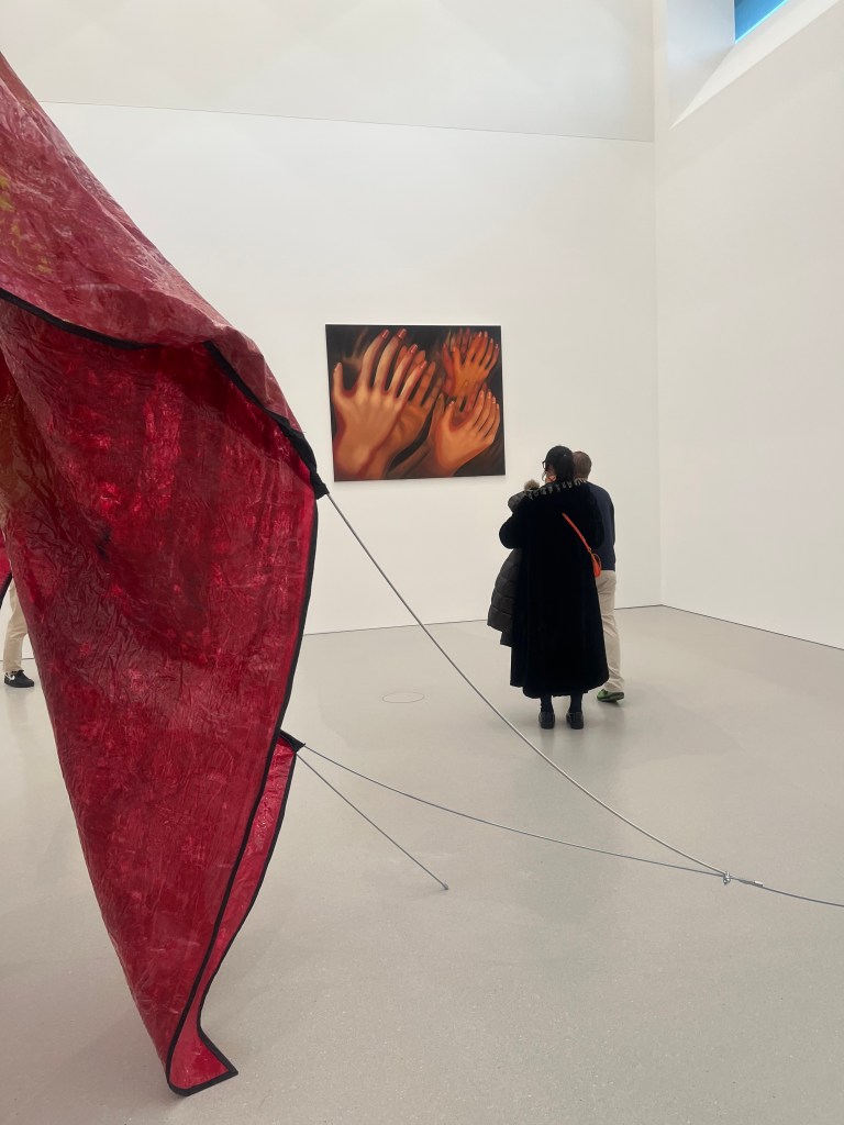 Mijam namiot Sandry Mujingii „Znikania” i bijące brawo ręce na pracy Karoliny Jabłońskiej. Obraz wygląda tak jakby ruch uderzających o siebie dłoni ciągle trwał, a my dzięki temu jesteśmy naocznymi świadkami aplauzu.