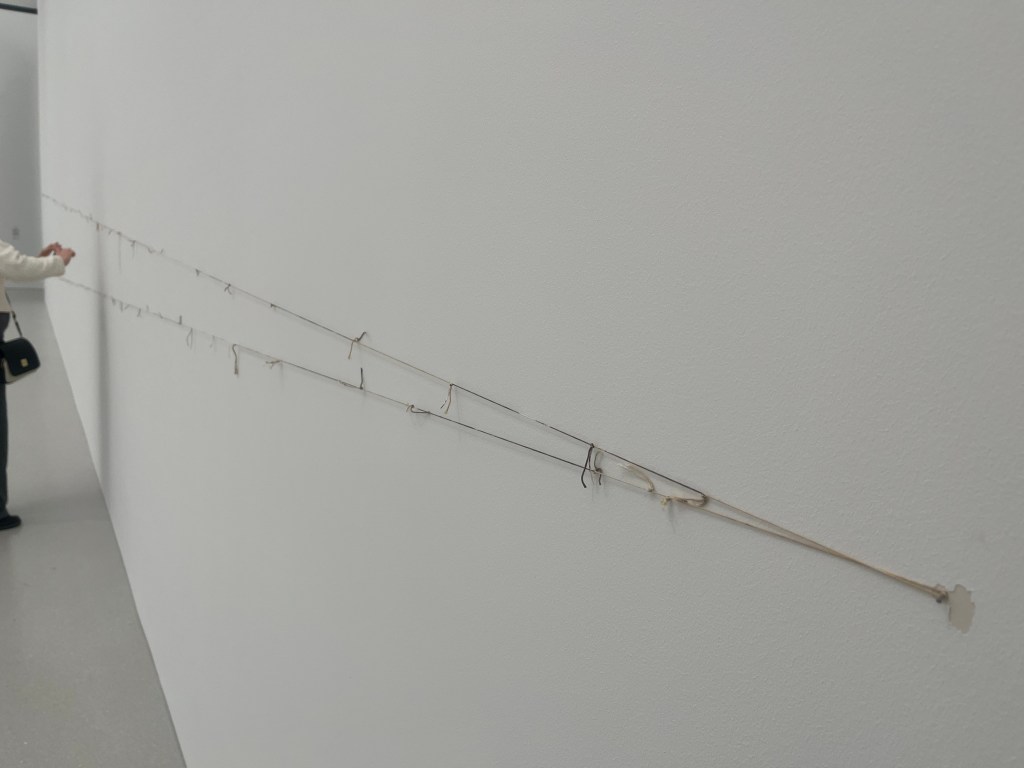 Podobnie chwyta za serce zwykła nitka, którą można łatwo przeoczyć – jest rozpięta na długości jednej ze ścian. To praca Teresy Margolles „127 Ciał”. Tak naprawdę nitka to nić chirurgiczna, którą były pozszywane anonimowe ciała ofiar przemocy ulicznej w mieście Meksyk. Artystka zajmuje się tematyką przemocy, morderstwami, interesują ją zarówno przyczyny, jaki i społeczne konsekwencje. Do tworzenia prac często wykorzystuje rzeczy znalezione w kostnicach – trudno o coś bardziej poruszającego i wstrząsającego.