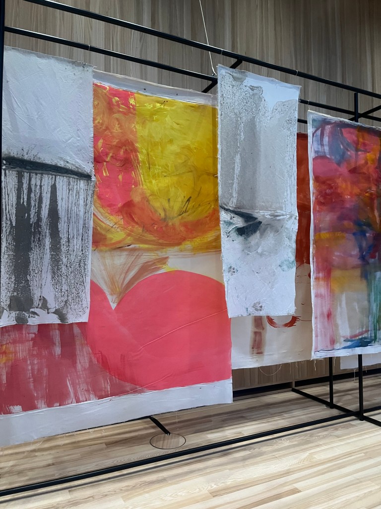 Kolor to znak rozpoznawczy dzieł Vivian Suter, które powstają przy współpracy ze strony natury. Artystka w 2005 roku myślała, że straciła wszystko, kiedy lawina błota zalała jej magazyn z dziełami. „Wtedy myślałam, że to katastrofa, ale gdy (obrazy) zaczęły wysychać, pojawiły się kolory, i zdałam sobie sprawę, że muszę zacząć pracować z naturą, nie przeciw niej” – mówi. Płótna umieszczone w sali przejściowej, służącej do odpoczynku, działają kojąco.