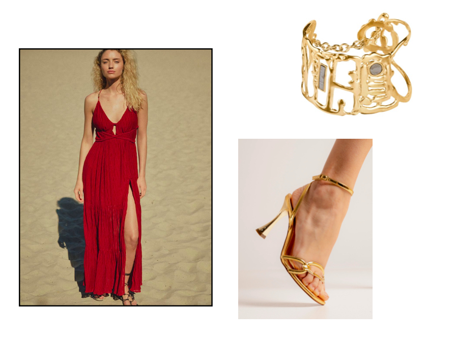 Stylizując takie sukienki trzeba jednak uważać, żeby nie przesadzić z dodatkami. Wybieramy małe torebki, wygodne, lekkie buty i coś z biżuterii, co podkreśli całość stylizacji, ale nie skradanie całej uwagi. Ja wybrałam dla was sukienkę z Reserved w pięknym, mocnym kolorze, z podkreśloną talią i rozcięciem z boku. Do niej proponuję bransoletkę Anny Orskiej z kolekcji Mateoros, tworząc ją projektantka wykorzystała fragmenty meteorytów Aletai i Campo del Cielo. Te szpilki w kolorze złota, to mega wygodny wybór od marki Hego’s.