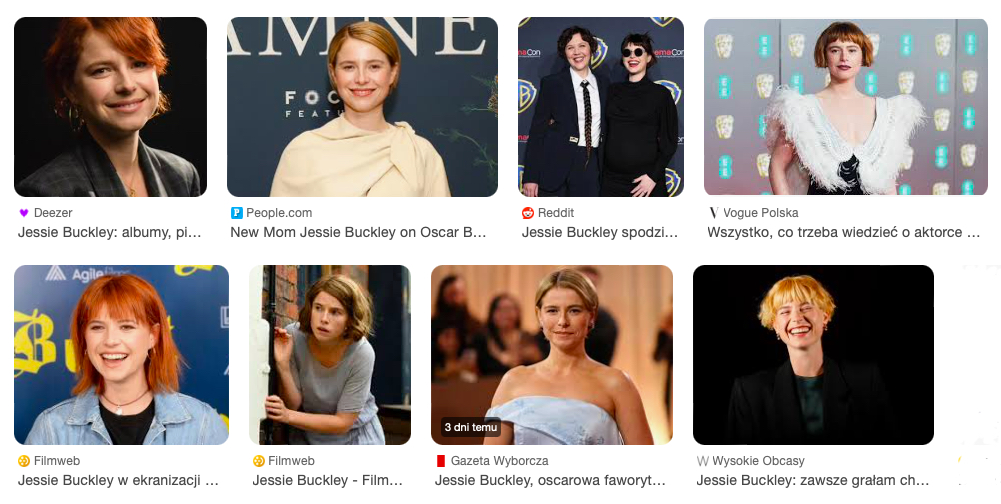Po internecie krążą dziś żarty, bo Buckley, ta olśniewająca, emocjonalna aktorka zgarnęła do tej pory wszystkie najważniejsze nagrody filmowe za rolę Agnes w filmie Chloe Zhao. A to sprawia, że jest numerem jeden w wyścigu po Oscara – „nie ma jak obstawiać, kto wygra Oscara dla najlepszej aktorki pierwszoplanowej… ten kto nie stawia na Buckley, przegra”, ”wyścig po Oscara stał się nudną rozrywką, Buckley już ma go w kieszeni” – komentują z przymróżeniem oka internauci. Jak to jest być numerem jeden? Aktorka odpowiada, że czuje się jak „zając w świetle reflektorów”, ale prawda jest taka, że chodzenie po czerwonym dywanie sprawia jej przyjemność, tak samo jak piękne stroje. Jej priorytetem pozostaje jednak bycie mamą – „w jednej chwili uśmiecham się do zdjęć, w drugiej karmię dziecko”, przyznaje bez ogródek.