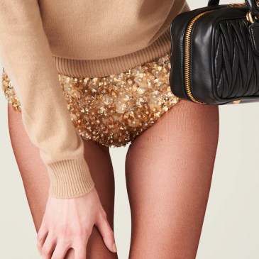 „Gdybym była młoda, to chodziłabym w figach” – powiedziała dziennikarzom Miuccia Pada po pokazie Miu Miu. Na wybiegu paradowały modelki ubrane w majtki, same majtki, w rajstopach, które wciągnięte były wysoko, zahaczały o wcięcie w talii. W pokazie szła aktorka Emma Corin – beżowy golf, złote, cekinowe majtki, rajtki, mała pikowana torebka i buty na … More Złote figi Miucci Prady